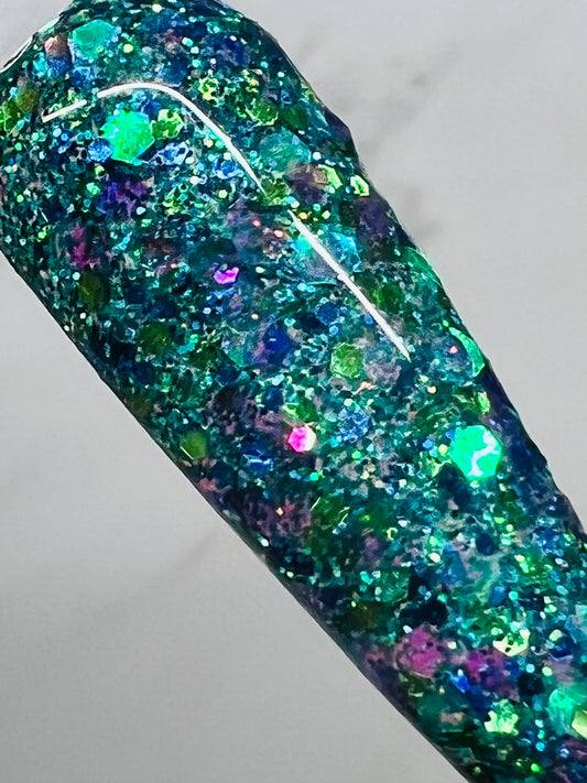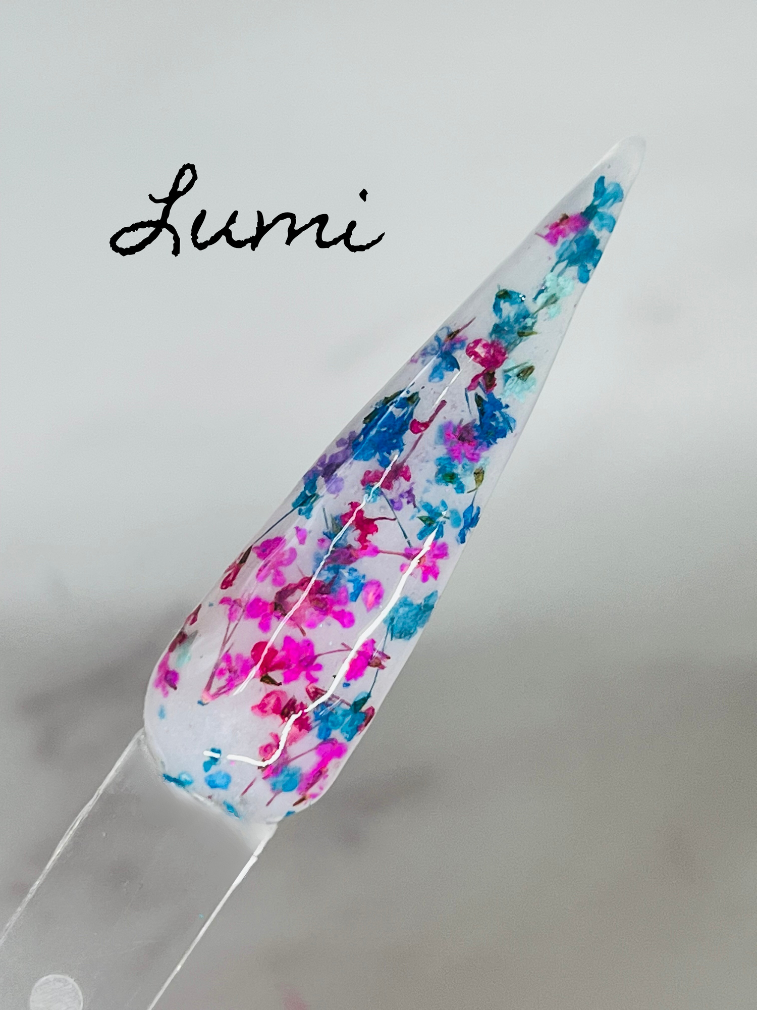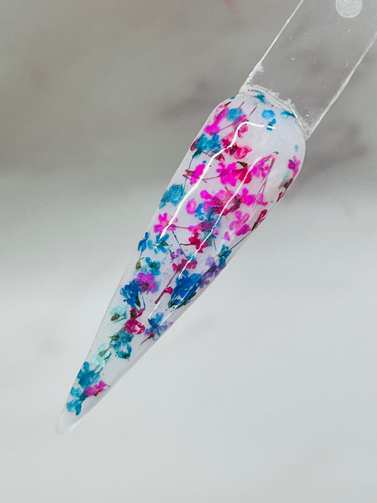 Lumi is a dreamy milky white base dip powder infused with delicate dried floral flakes in vibrant pinks, teals, and soft purples, creating a light, airy design that feels effortlessly romantic and eye-catching.
